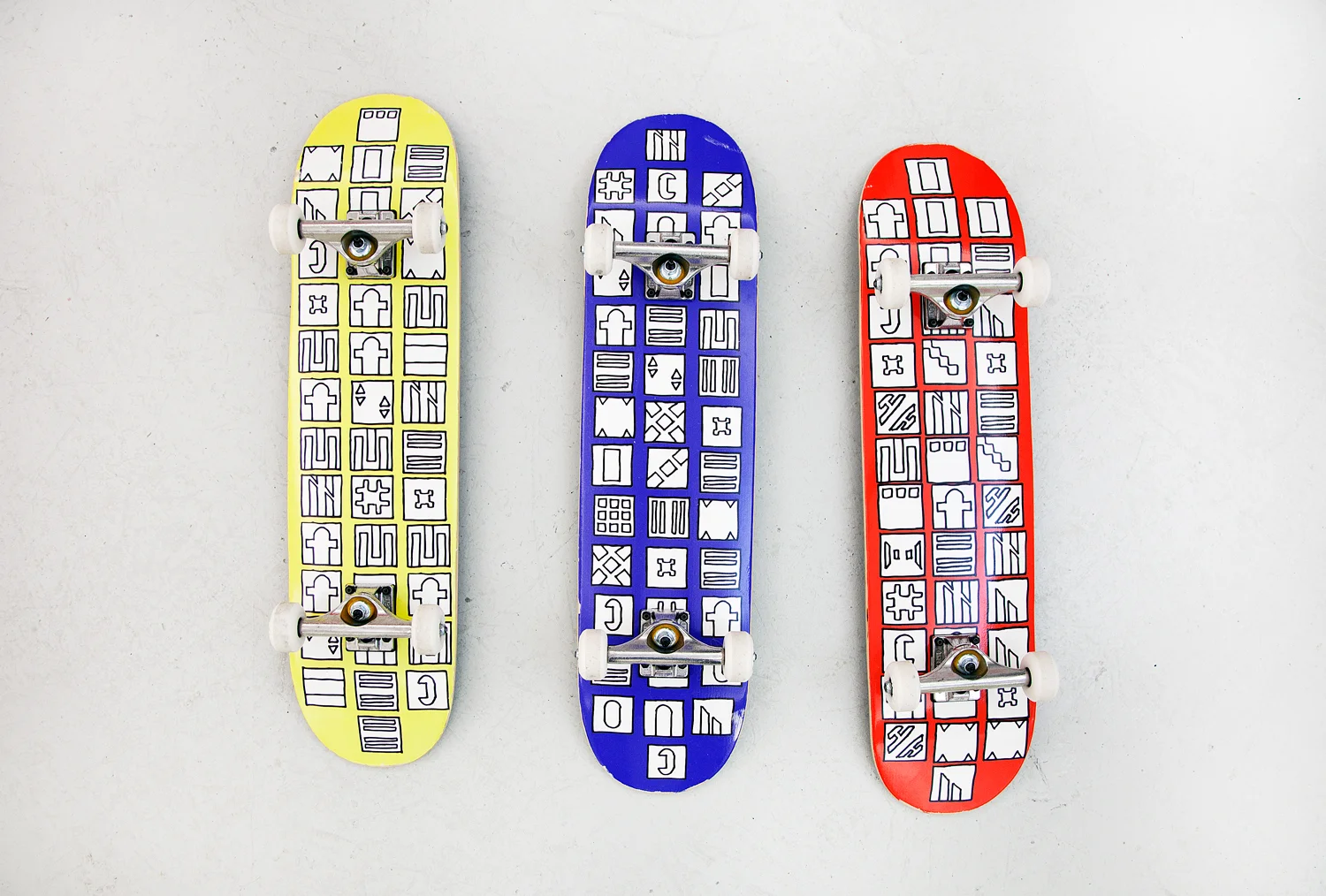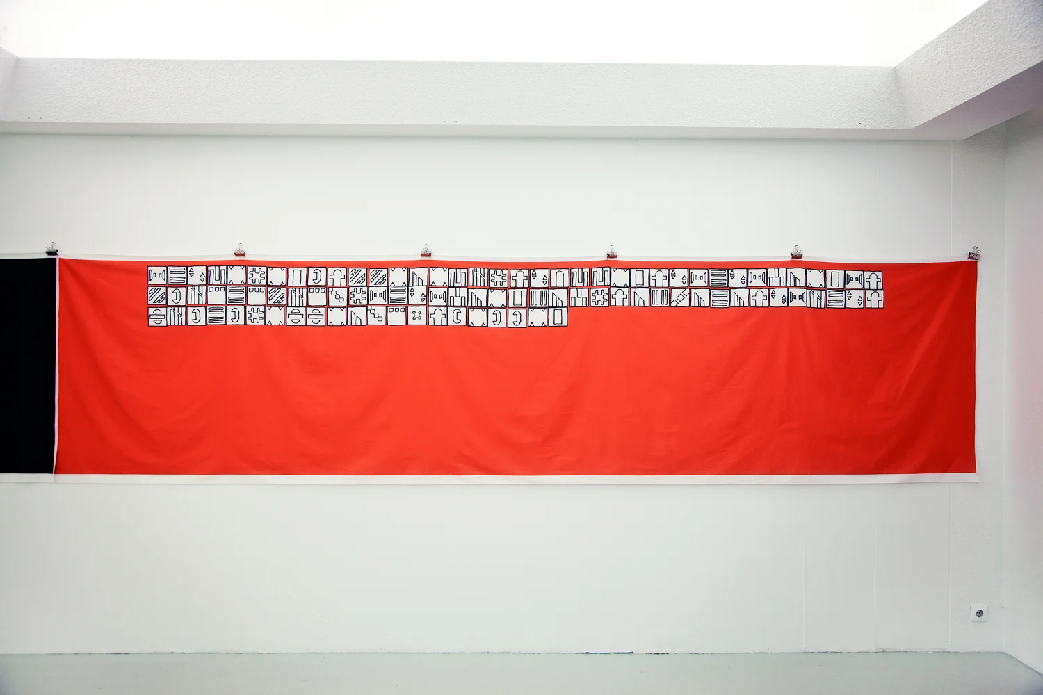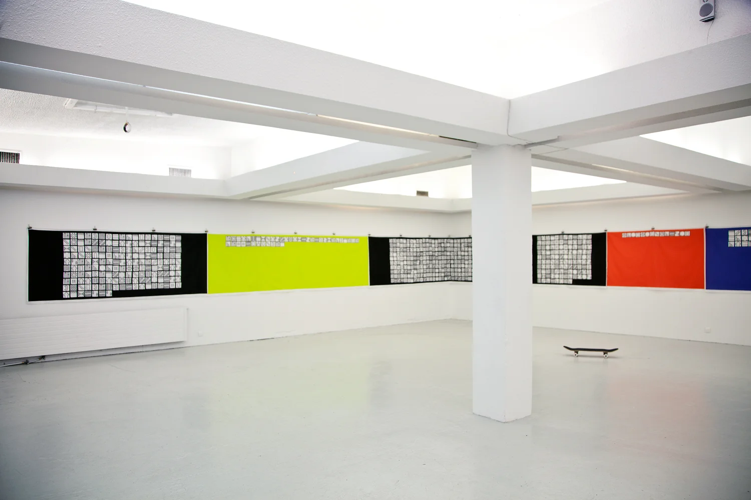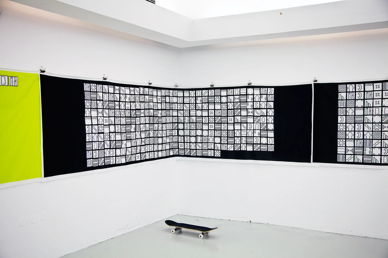 Privacy, secrecy, interaction and essentially the notion of friendship was the central theme of the exhibition. Going through their personal correspondence the collaborators found phrases and parts of texts which were chosen to be coded and then printed on the tapestry and skateboards. Some of the texts were personal and shed light on private thoughts of the collaborators, thoughts they would only present to each other in light of their friendship. Viewers were given ciphers to decipher the code, being in the process able to understand the texts underneath. Although the texts were taken out of their original context, viewers would still be able to grasp the intimacy and privacy from the correspondence.